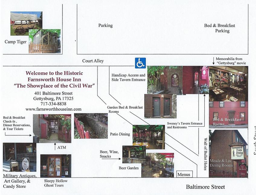 Our Bed & Breakfast guests enjoy lovely Victorian rooms. For a dining experience reminiscent of the Civil War era, our Meade and Lee dining rooms offer Pennsylvania Dutch and period fare served by period dressed servers. Our family friendly Sweney's Tavern features a vast collection of props from the movie, Gettysburg. The garret (attic) holds a personal collection of Civil War artifacts. The Farnsworth House has won many awards and recognition over the years. A&E, BBC, Food Network, Discovery, History, Sci-Fi, and Travel Channels, Hollywood Squares and Wheel of Fortune have featured our Historic Inn.